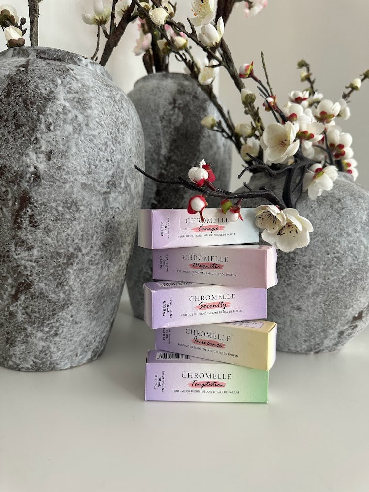 Be unforgettable. Captivating and long-lasting, Chromelle perfume oils melt into your pulse points and evolve with your body heat - leaving behind a sensual scent that lingers all day and night.